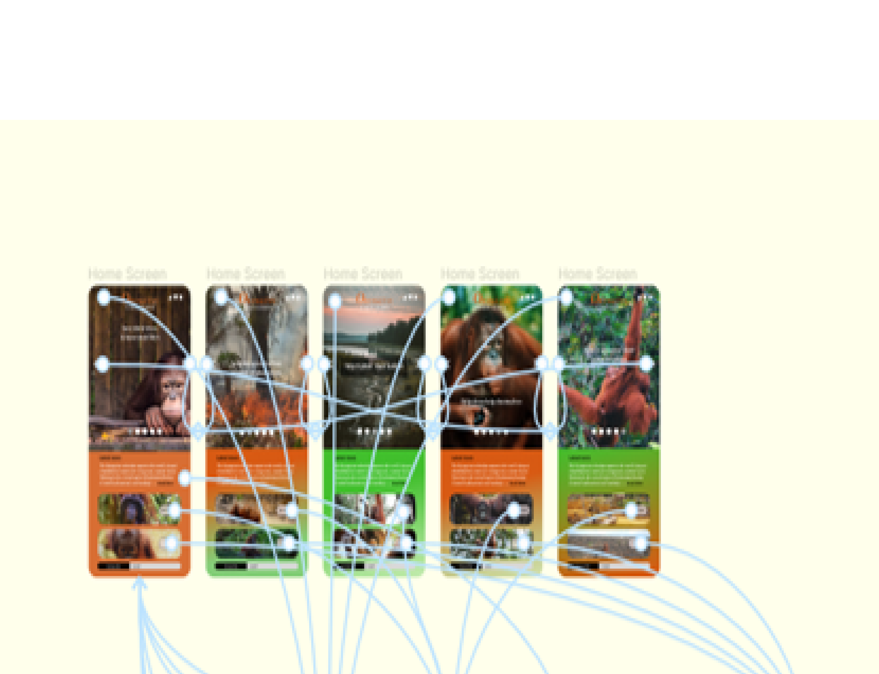 After finalizing the initial wireframe structure, I delved deeper into my research to develop a captivating design system. This system, composed of nature-inspired colours of greens and oranges and a vibrant style, to enhance the visual appeal of the Orangutan Salvation website and mobile app, drawing users in and aligning with the habitat of the Orangutan
