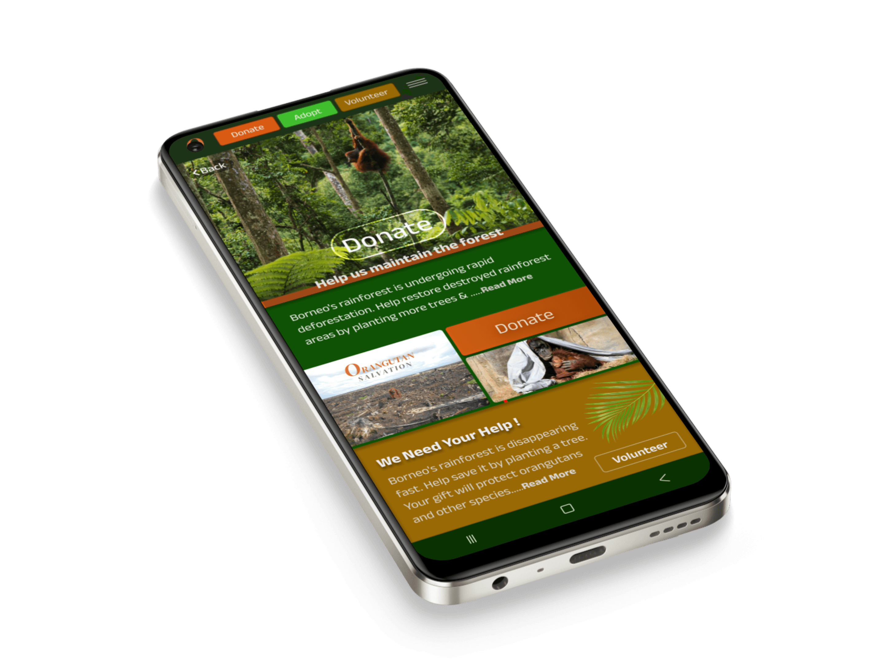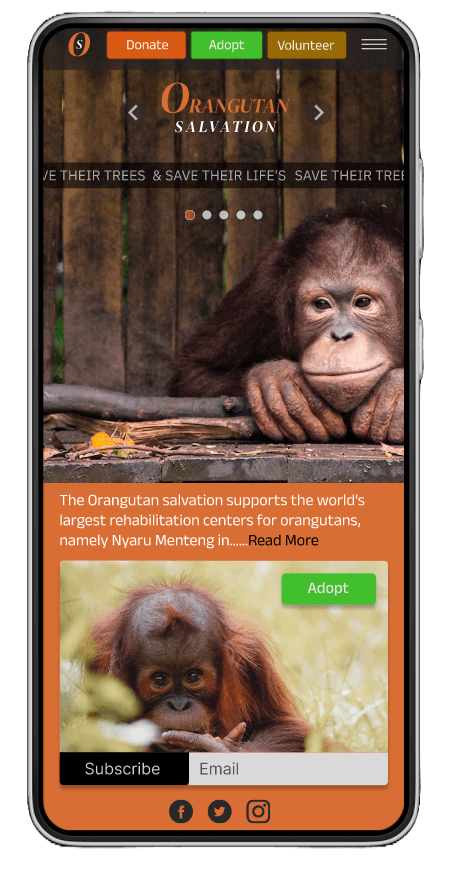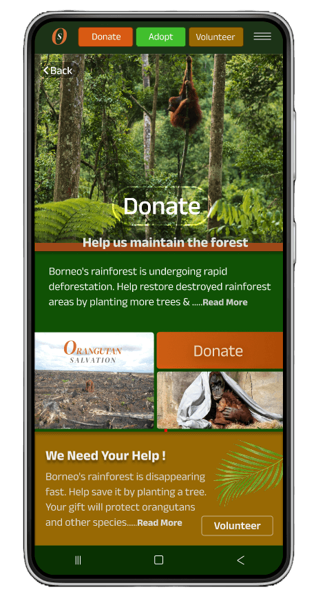 Users are guided on most screens with three clear calls to action (CTAs): Donate, Adopt, or Volunteer. These options encourage users to support Orangutan Salvation's efforts to repair and restore the orangutan habitat and ensure their survival. On smaller screens, such as Apple Watches, these options are accessible through a hamburger menu to optimize screen space.
